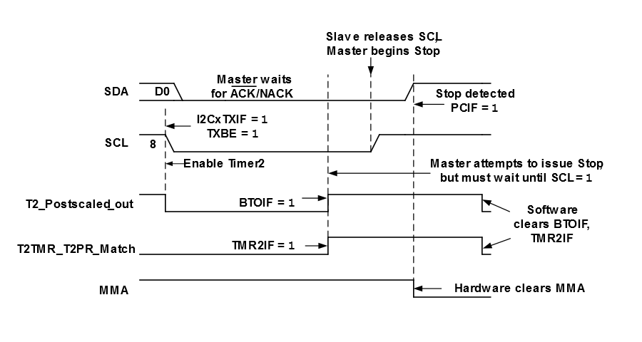 For example, Timer2 can be selected as the bus time-out source and set to begin counting when the SCL line is low. If Timer2 rolls over before the SCL line transitions high, the module is reset.