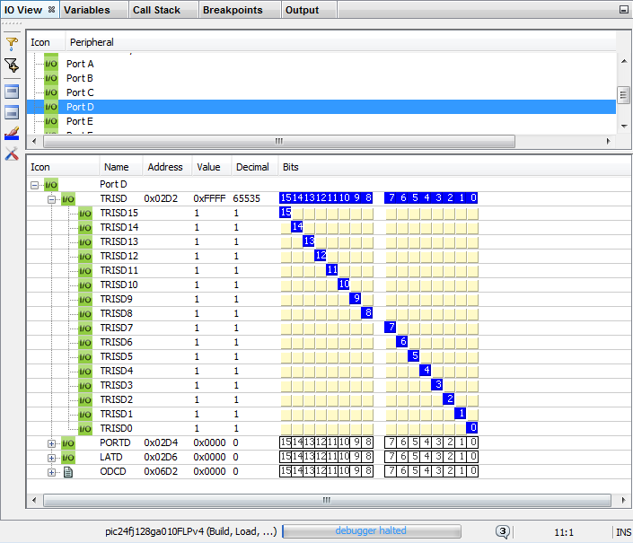 Use the I/O View window (Window>Debugging>IO View) to see an overview of registers of the target device for the current project. It serves as a quick reference during design and is capable of displaying register values when the project is in debug mode.