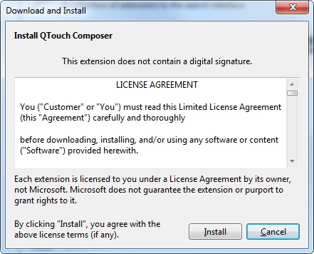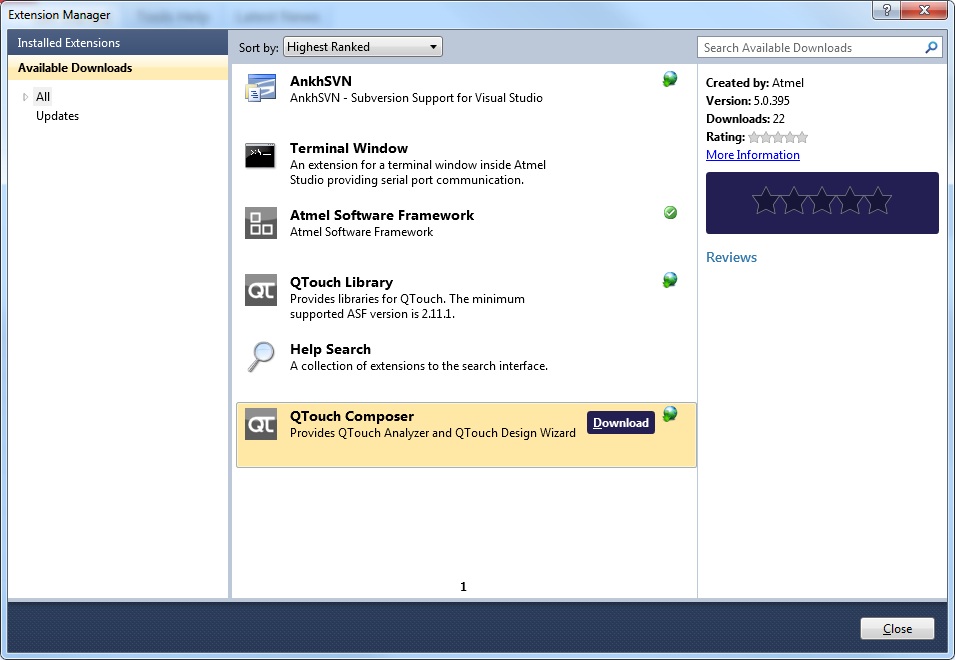 Select QTouch Composer and press Download. If you have not previously registered as a user in the Extension Gallery you will be taken to the Registering at the Microchip Gallery at this point.