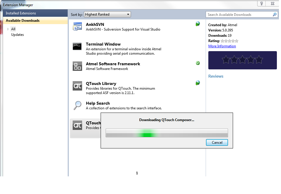 The download will start as indicated in the status bar of Atmel Studio. If the extension is distributed as a standalone installer you will be asked for a location to save the file. Downloading can take several minutes for large files. A dialog with a running bar is displayed during download. Not that download can take a long time for large extensions. Press Cancel to abort the download.