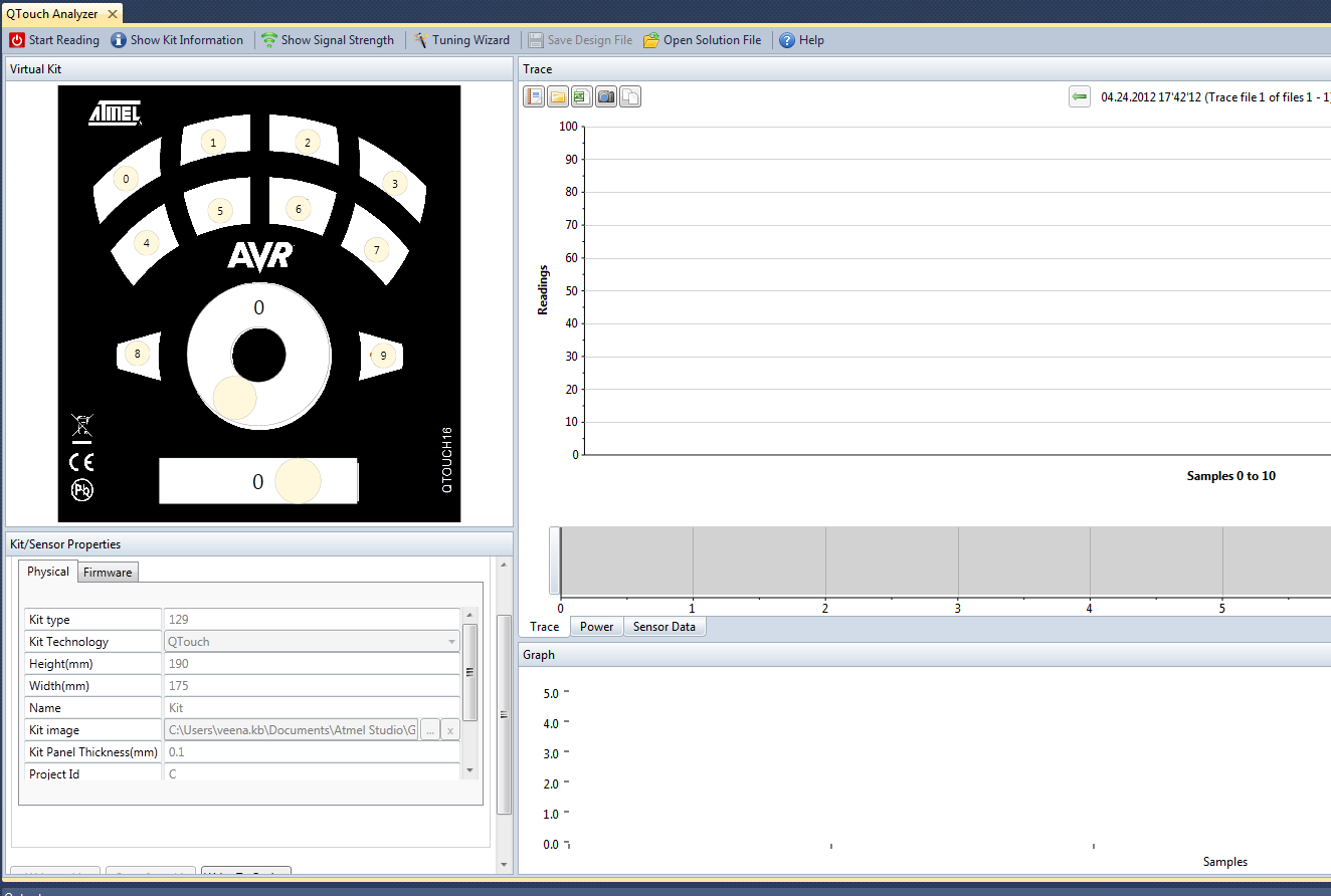 The QTouch Analyzer reads and interprets touch data sent from the QTouch kit into different views. The Analyzer is separated into Kit View, Kit/Sensor Properties, Sensor Data, Trace View, Power View, and Graph view. When the touch kit is connected and Atmel Studio is opened, the QTouch Analyzer window opens up and the connection information is updated.