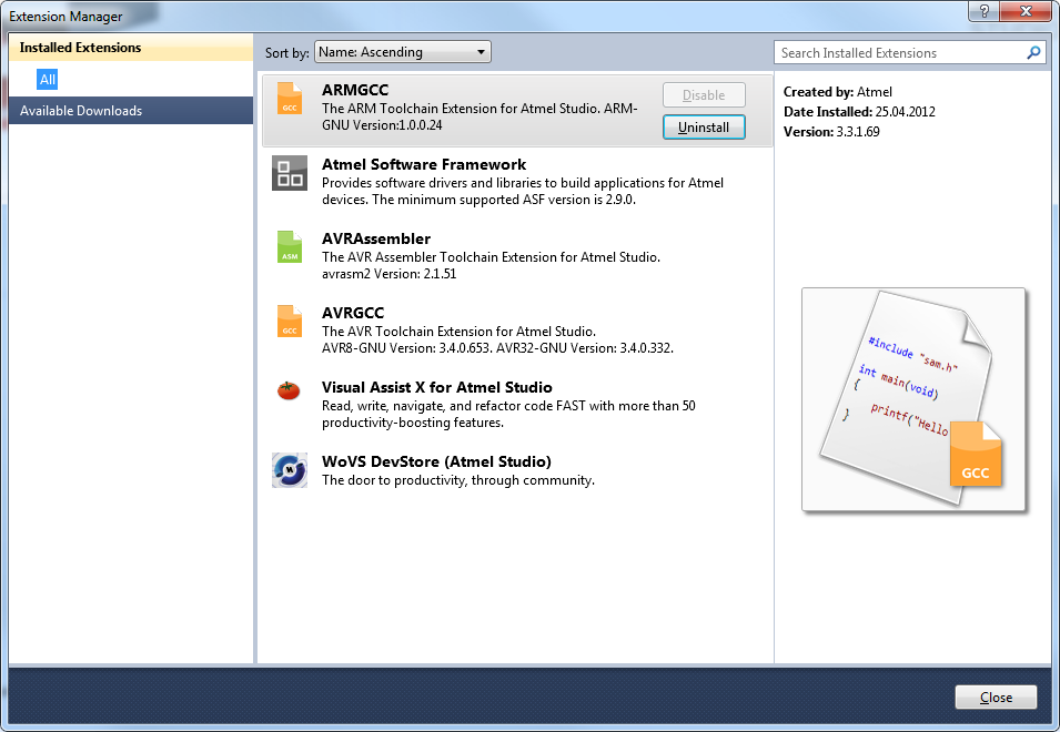 To get started with the extension manager, check the Installing New Extensions in Atmel Studio.