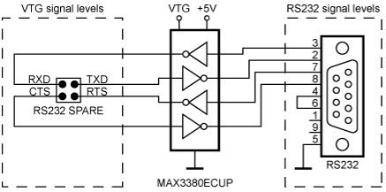 Optionally, one can connect the RTS (Request To Send) and CTS (Clear To Send) signals to two free I/O ports. The RTS and CTS signals are used for flow control. The connection is shown below.
